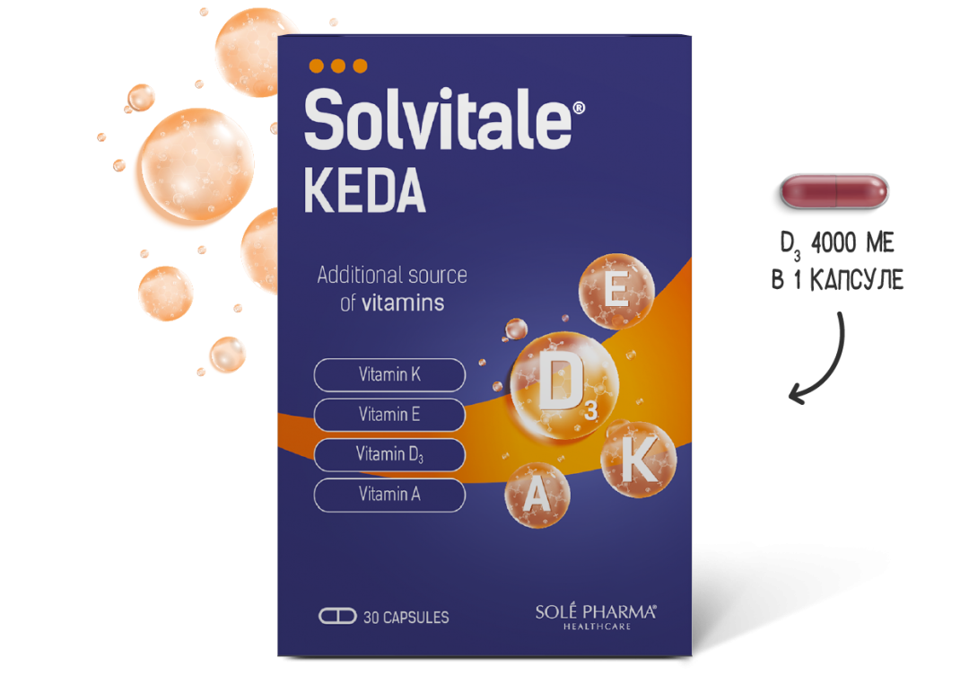 Solvitalе® KEDA — жирорастворимый витаминный комплекс, состоящий из витаминов D3, K2 (MK-7), A и E.